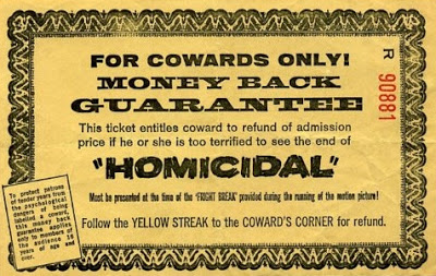 Homicidal (1961): This film contained a “Fright break” with a 45 second timer overlaid over the film’s climax as the heroine approached a house harbouring a sadistic killer. A voice-over advised the audience of the time remaining in which they could leave the theatre and receive a full refund if they were too frightened to see the remainder of the film. To ensure the more wily patrons did not simply stay for a second showing and leave during the finale Castle had different colour tickets printed for each show. In a trailer for the film, Castle explained the use of the Coward’s Certificate and admonished the viewer to not reveal the ending of the film to friends, “or they will kill you. If they don’t, I will.” About 1% of patrons still demanded refunds, and in response: