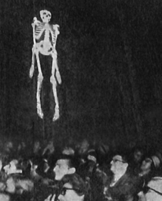 House on Haunted Hill (1959): Filmed in “Emergo”. An inflatable glow in the dark skeleton attached to a wire floated over the audience during the final moments of some showings of the film to parallel the action on the screen when a skeleton arose from a vat of acid and pursued the villainous wife of Vincent Price. The gimmick did not always instill fright; sometimes the skeleton became a target for some audience members who hurled candy boxes, soda cups or any other objects at hand at the skeleton.