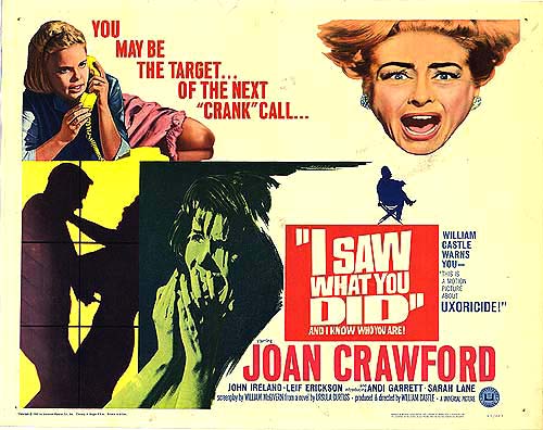 Strait-Jacket (1964): Joan Crawford. Advised by his financial backers to eliminate gimmicks, Castle hired Crawford to star and sent her on a promotional tour to theatres. At the last minute, Castle had cardboard axes made and handed out to patrons.