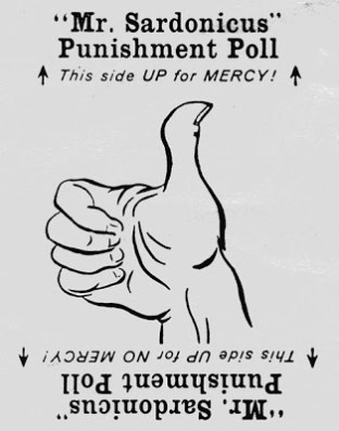 Mr. Sardonicus (1961): In this gothic tale set in 1880 London a baron’s face is frozen into a permanent grotesque hideous smile after digging up his father’s grave to retrieve a lottery ticket left in the pocket of his father’s jacket. The audiences were allowed to vote in a “punishment poll” during the climax of the film – Castle himself appears on screen to explain to the audience their options. Each member of the audience was given a card with a glow in the dark thumb they could hold either up or down to decide if Mr. Sardonicus would be cured or die during the end of the film. Supposedly, no audience ever offered mercy so the alternate ending was never screened. However, an alternate version was filmed for drive-ins, in which drivers were asked to flash their car’s headlights in response.