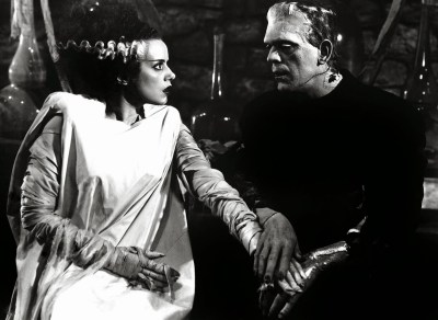 It was no honeymoon for her, for some ten days, Lanchester was wrapped in yards of bandage and covered in heavy make-up. The stand-on-end hairdo was accomplished by combing it over a wire mesh cage. Lanchester was in real agony with her eyes kept taped wide open for long takes – and it showed in her looks of horror. Her monster’s screaming and hissing sounds (based on the sounds of Regents Park swans in London) were taped and then run backward to spook-up the effect. She was delightfully melodramatic and picturesque as Wollstonecraft, and her bride would become iconic.
