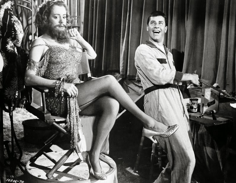She entered the 1950’s busy with road touring of her nightclub act with pianist J. Raymond Henderson (who went by “Ray” and who is sometimes confused with popular songwriter Ray Henderson). There was a series of tours to complement Laughton’s famous reading tours, called Elsa Lanchester’s Private Music Hall which ended in 1952; Elsa Lanchester – Herself which ended in 1961; and once more in 1964 at the Ivar Theater. More supporting roles followed in the early 1950’s, including a 2-minute cameo as the Bearded Lady in “3 Ring Circus”, about to be shaved by Jerry Lewis. She then had another substantial part when she appeared again with her husband in the screen version of Agatha Christie’s play “Witness For The Prosecution” (1957) for which both received Academy Award nominations – she for the second time as Best Supporting Actress, and Laughton, also for the second time, for Best Actor. Neither won. However, Lanchester did win the Golden Globe for Best Supporting Actress for the film.