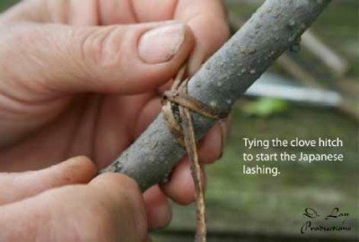 First, you are going to lash or tack the sticks parallel to each other, the straight stick about one to two inches down from the top of the forked stick. To learn about tying a lashing click HERE. Start the lashing with a clove hitch and then cross the “arms” stick perpendicular to the “body” and tie the lashing.