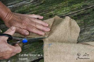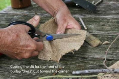 Using scissors, snip the apex of the triangle you’ve formed to make a small hole in the cloth, big enough to slip the “head” of the stick figure through, and unfold the cloth.