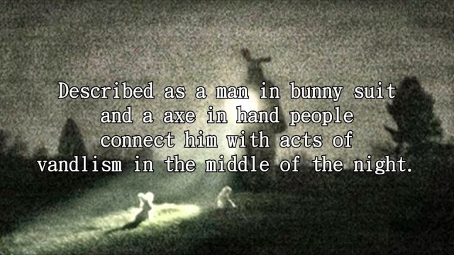 There are many variations to the legend, but most involve a man wearing a rabbit costume who attacks people with an axe.