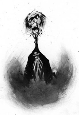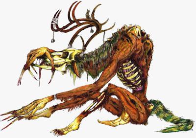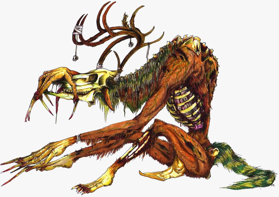 “The Wendigo was gaunt to the point of emaciation, its desiccated skin pulled tautly over its bones. With its bones pushing out against its skin, its complexion the ash gray of death, and its eyes pushed back deep into their sockets, the Wendigo looked like a gaunt skeleton recently disinterred from the grave. What lips it had were tattered and bloody, unclean and suffering from suppurations of the flesh, the Wendigo gave off a strange and eerie odour of decay and decomposition, of death and corruption.”