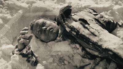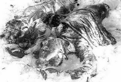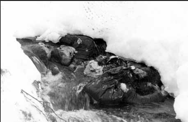 “that the group woke up in a panic and cut their way out the tent either because an avalanche had covered the entrance to their tent or because they were scared that an avalanche was imminent (better to have a potentially repairable slit in a tent than risk being buried alive in it under tons of snow). They were poorly clothed because they had been sleeping, and ran to the safety of the nearby woods where trees would help slow oncoming snow. In the darkness of night they got separated into two or three groups; one group made a fire (hence the burned hands) while the others tried to return to the tent to recover their clothing, since the danger had apparently passed. But it was too cold, and they all froze to death before they could locate their tent in the darkness. At some point some of the clothes may have been recovered or swapped from the dead, but at any rate the group of four whose bodies were most severely damaged were caught in an avalanche and buried under 13 feet of snow (more than enough to account for the ‘compelling natural force’ the medical examiner described). Dubinina’s tongue was likely removed by scavengers and ordinary predation.”