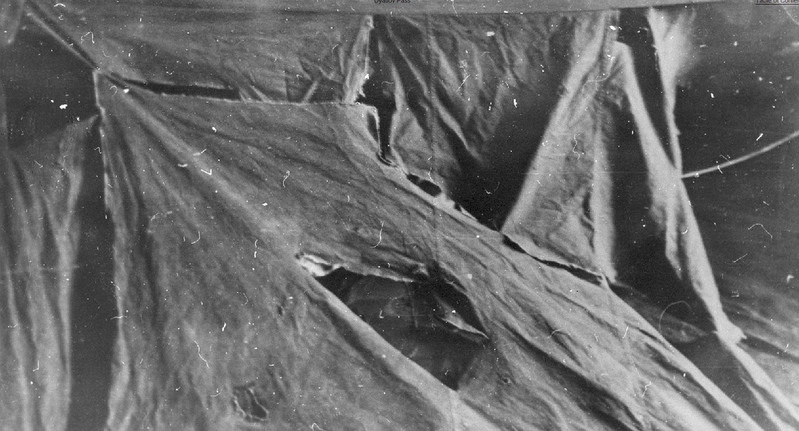 On February 26, the searchers found the group’s abandoned and badly damaged tent on Kholat Syakhl. The campsite baffled the search party. Mikhail Sharavin, the student who found the tent, said “the tent was half torn down and covered with snow. It was empty, and all the group’s belongings and shoes had been left behind.” Investigators said the tent had been cut open from inside. Eight or nine sets of footprints, left by people who were wearing only socks, a single shoe or were even barefoot, could be followed, leading down toward the edge of a nearby woods, on the opposite side of the pass, 1.5 kilometres (0.93 mi) to the north-east. However, after 500 metres (1,600 ft) these tracks were covered with snow.