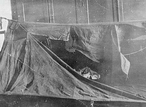 At the forest’s edge, under a large cedar, the searchers found the visible remains of a small fire, along with the first two bodies, those of Krivonischenko and Doroshenko, shoeless and dressed only in their underwear. The branches on the tree were broken up to five metres high, suggesting that one of the skiers had climbed up to look for something, perhaps the camp. Between the cedar and the camp the searchers found three more corpses: Dyatlov, Kolmogorova and Slobodin, who seemed to have died in poses suggesting that they were attempting to return to the tent. They were found separately at distances of 300, 480 and 630 metres from the tree.