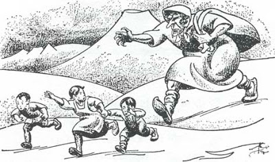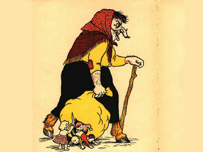 Other descriptions of Grýla say that she had 300 heads and 3 eyes on each head. She kidnaps the children and she and her husband, Leppalúði, put them in a large sack. Another account says that she has bad nails on each finger, eyes in the back of her head and horns like a goat, the ears dangle down to her shoulders and are fastened to her nose. Her chin is bearded and her teeth are like charcoal.