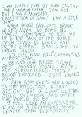 Hello from the gutters of N.Y.C. which are filled with dog manure, vomit, stale wine, urine and blood. Hello from the sewers of N.Y.C. which swallow up these delicacies when they are washed away by the sweeper trucks. Hello from the cracks in the sidewalks of N.Y.C. and from the ants that dwell in these cracks and feed in the dried blood of the dead that has settled into the cracks. J.B., I’m just dropping you a line to let you know that I appreciate your interest in those recent and horrendous .44 killings. I also want to tell you that I read your column daily and I find it quite informative. Tell me Jim, what will you have for July twenty-ninth? You can forget about me if you like because I don’t care for publicity. However you must not forget Donna Lauria and you cannot let the people forget her either. She was a very, very sweet girl but Sam’s a thirsty lad and he won’t let me stop killing until he gets his fill of blood. Mr. Breslin, sir, don’t think that because you haven’t heard from me for a while that I went to sleep. No, rather, I am still here. Like a spirit roaming the night. Thirsty, hungry, seldom stopping to rest; anxious to please Sam. I love my work. Now, the void has been filled. Perhaps we shall meet face to face someday or perhaps I will be blown away by cops with smoking .38’s. Whatever, if I shall be fortunate enough to meet you I will tell you all about Sam if you like and I will introduce you to him. His name is “Sam the terrible.” Not knowing the what the future holds I shall say farewell and I will see you at the next job. Or should I say you will see my handiwork at the next job? Remember Ms. Lauria. Thank you. In their blood and from the gutter “Sam’s creation” .44 Here are some names to help you along. Forward them to the inspector for use by N.C.I.C: “The Duke of Death” “The Wicked King Wicker” “The Twenty Two Disciples of Hell” “John ‘Wheaties’ – Rapist and Suffocator of Young Girls. PS: Please inform all the detectives working the slaying to remain. P.S: JB, Please inform all the detectives working the case that I wish them the best of luck. “Keep ’em digging, drive on, think positive, get off your butts, knock on coffins, etc.” Upon my capture I promise to buy all the guys working the case a new pair of shoes if I can get up the money. Son of Sam