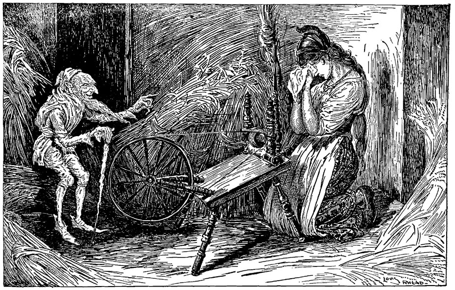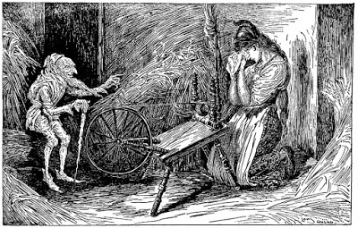 With a gruesome ending, the Brothers Grimm’s Rumpelstiltskin tells the story of an imp who makes a deal with a miller’s daughter. Her father tells the king she can weave straw into gold (she can’t) so he puts her to it, saying he’ll kill her if she doesn’t do it by morning. The girl meets an imp and they make a deal: he’ll weave the straw into gold if she gives him her firstborn. When the child is born, she can’t give it up. He agrees to relent if she can guess his real name. The girl snoops at his house and overhears him singing it. Next day, she tells him his true name and, in a fit of rage, he drives his right foot into the ground then grabs his left foot and tears himself in two.