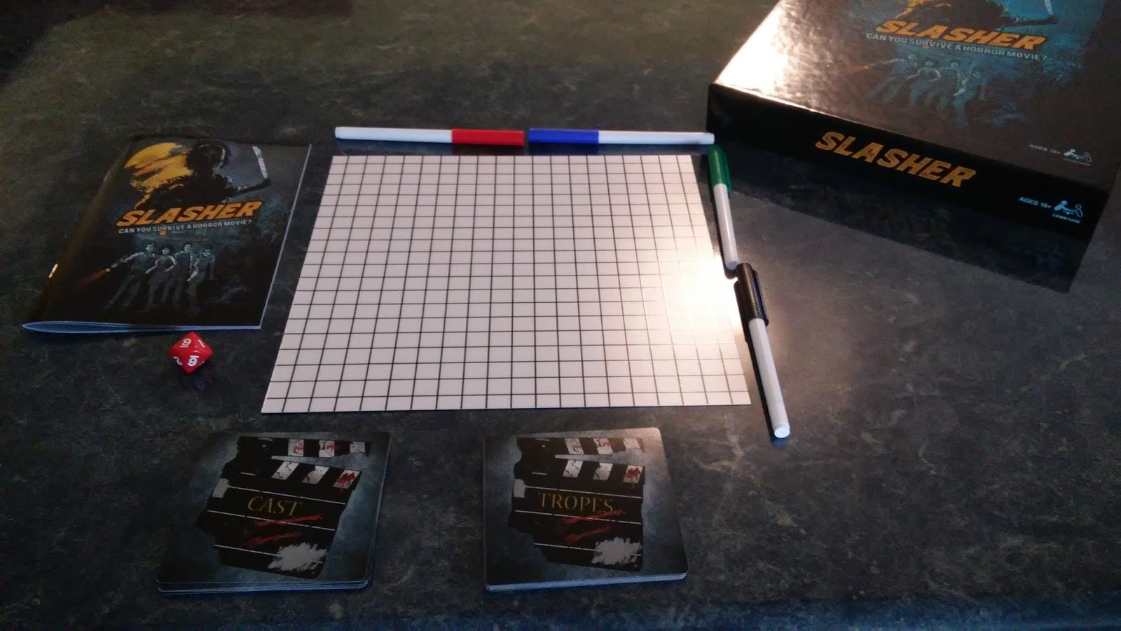 One player creates the Slasher character by choosing from different perks and abilities. One player is the Producer, who is responsible for coming up with the storyline, setting, etc. and has a deck of Trope cards to play to try and ensure that a certain amount of Slasher movie rules are met. The rest make the cast of the stereotypical characters from the movies and have to try to survive or defeat the Slasher.