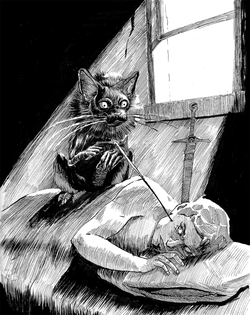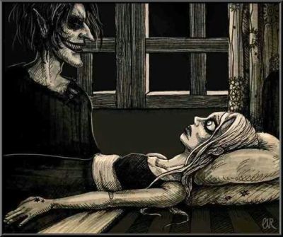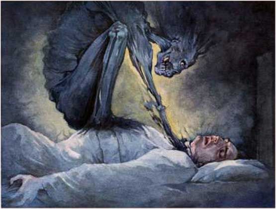 In Catalonia legend and popular culture, the Pesanta is an enormous dog (or sometimes a cat) that goes into people’s houses in the night and puts itself on their chests making it difficult for them to breathe and causing them the most horrible nightmares. The Pesanta is black and hairy, with steel paws, but with holes so it can’t take anything. In Sardinia, one of Italy’s islands, there is an old belief that identifies the cause of sleep paralysis in a demoniac being called “Ammuttadori”. This ghoulish creature sits in the chest of the sleeping victim, suffocating him and, sometimes, ripping the skin with his nails. It is also believed, in some parts of the island, that this demon wears seven red caps on his head: if the victim resists the pain and succeeds to steal one of the caps, he will soon find a hidden treasure as a reward. In Latvian folk culture sleep paralysis is called a torture or strangling by Lietuvēns. It is thought to be a soul of a killed (strangled, drowned, hanged) person and attacks both people and domestic animals. When under attack, one must move the toe of the left foot to get rid of the attacker.