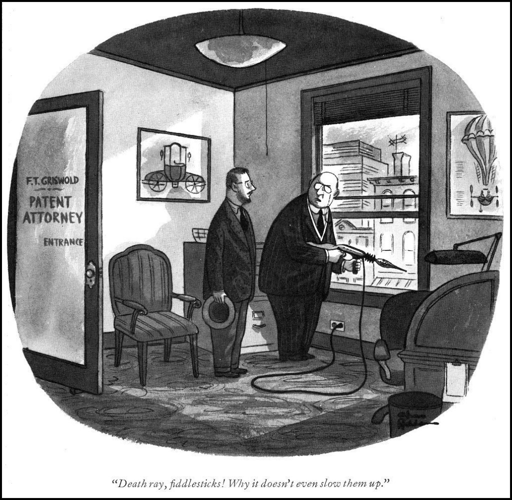 He also created a syndicated comic strip, “Out of This World”, which ran in 1956. There are many collections of his work, including “Drawn And Quartered” (1942) and “Monster Rally” (1950), the latter with a foreword by John O’Hara. Typical of Addams’ work, one cartoon shows two men standing in a room labelled “Patent Attorney”. One is pointing a bizarre gun out the window toward the street and saying: “Death ray, fiddlesticks! Why, it doesn’t even slow them up!”