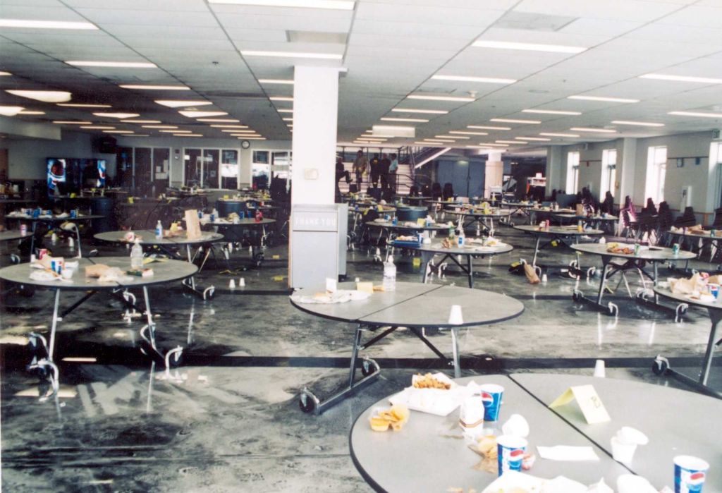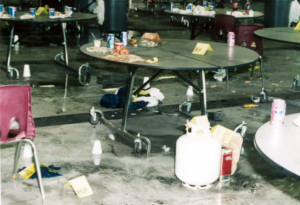 On Tuesday morning, April 20, 1999, just weeks before Harris and Klebold were both due to graduate, Harris and Klebold placed two duffel bags in the cafeteria. Each bag contained propane bombs, which were set to detonate at 11:17a.m., during the “A” lunch shift. No witness recalled seeing the duffel bags being added to the 400 or so backpacks that were already in the cafeteria. The security staff at CHS did not observe the bags being placed in the cafeteria; a custodian was replacing the school security videotape at around 11:14 a.m., which might have been the time that the duffel bags were dropped off. Some internet sleuths claimed that the bomb placement can be seen on the surveillance video at around 10:58a.m. Shortly after the massacre, police also investigated whether the bombs were placed during the after-prom party held the prior weekend. Jefferson County Sheriff’s Deputy Neil Gardner was assigned to the high school as a full-time school resource officer. Gardner usually ate lunch with students in the cafeteria, but on April 20 he was eating lunch in his patrol car at the northwest corner of the campus, watching students in the Smokers’ Pit in Clement Park, a meadow adjacent to the school. Two backpacks filled with pipe bombs, aerosol canisters, and small propane bombs were also placed in a field about 3 miles (4.8km) south of CHS, and 2 miles (3.2km) south of the fire station. Set to detonate at 11:14a.m., the bombs were intended as a diversion to draw firefighters and emergency personnel away from the school. Only the pipe bombs and one of the aerosol canisters detonated, causing a small fire, which was quickly extinguished by the fire department. It went off when moved. Bomb technicians immediately examined the bombs and relayed to police at the school the possibility of devices with motion activators. Around 11:10a.m., Harris and Klebold arrived separately at CHS. Harris parked his vehicle in the junior student parking lot, and Klebold parked in the adjoining senior student parking lot. The school cafeteria was their primary bomb target; the cafeteria had a long outside window-wall, ground-level doors, and was just north of the senior parking lot. The library was located above the cafeteria in the second-story of the window-wall. Each car contained bombs timed to detonate at 12:00p.m. As Harris pulled into the parking lot, he encountered classmate Brooks Brown, with whom he had recently patched up a longstanding series of disputes. According to Brown, who was smoking a cigarette, he was surprised to see Harris, whom he earlier noted had been absent from a class test. Brown confronted Harris about missing the test because Harris was always serious about schoolwork and being on time. Harris seemed unconcerned, commenting “It doesn’t matter anymore.” Harris went on: “Brooks, I like you now. Get out of here. Go home.” Brown, feeling uneasy, and already prepared to skip his next class, walked away down South Pierce Street. Meanwhile, Harris and Klebold armed themselves, using straps and webbing to conceal weapons beneath black trench coats. They lugged backpacks and duffel bags that were filled with pipe bombs and ammunition. Harris also had his shotgun in one of the bags. Beneath the trench coats, Harris wore a homemade bandolier and a white T-shirt that read “Natural selection” in black letters; Klebold wore a black T-shirt that read “Wrath” in red letters. The cafeteria bombs failed to detonate. Had these bombs exploded with full power, they could have killed or severely wounded all of the 488 students in the cafeteria, and possibly made the ceiling collapse by destroying the pillars holding it up, dropping the library into the cafeteria.
