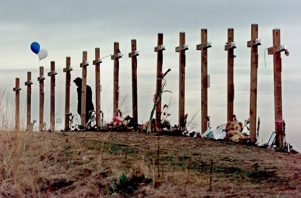On the morning of April 21, bomb squads combed the high school. By 8:30a.m., the official death toll of 15 was released. The earlier estimate was ten over the true death toll count, but close to the total count of wounded students. The total count of deaths was 12 students (14 including the shooters) and one teacher; 20 students and one teacher were injured as a result of the shootings. Three more victims were injured indirectly as they tried to escape the school. It was then the worst school shooting in U.S. history. At 10:00a.m., the bomb squad declared the building safe for officials to enter. By 11:30a.m., a spokesman of the sheriff declared the investigation underway. Thirteen of the bodies were still inside the high school as investigators photographed the building. At 2:30p.m., a press conference was held by Jeffco District Attorney David Thomas and Sheriff John Stone, at which they said that they suspected others had helped plan the shooting. Formal identification of the dead had not yet taken place, but families of the children thought to have been killed had been notified. Throughout the late afternoon and early evening, the bodies were gradually removed from the school and taken to the Jeffco Coroner’s Office to be identified and autopsied. By 5:00p.m., the names of many of the dead were known. An official statement was released, naming the 15 confirmed deaths and 27 injuries related to the massacre. On April 22, the cafeteria bombs were discovered. In the days following the shootings, Rachel Scott’s car and John Tomlin’s truck became memorials, and impromptu memorials were held in Clement Park. There was controversy over whether Harris and Klebold should be memorialized. Some were opposed, saying that it glorified murderers, while others argued that Harris and Klebold were also victims. On April 30, carpenter Greg Zanis, atop a hill near Columbine High School, erected fifteen 6-foot-tall wooden crosses to honour those who had died at the school. Daniel Rohrbough’s father cut down the two meant for the gunmen, saying that murderers should not be memorialized in the same place as victims. There were also fifteen trees planted, and he cut down two of those as well. Also on April 30, high-ranking officials of Jefferson County (Jeffco) and the Jeffco Sheriff’s Office met to decide if they should reveal that Michael Guerra had drafted an affidavit for a search warrant of Harris’s residence more than a year before the shootings, based on his previous investigation of Harris’s website and activities. Since the affidavit’s contents lacked the necessary probable cause, they decided not to disclose this information at a press conference held on April 30, nor did they mention it in any other way. Over the next two years, Guerra’s original draft and investigative file documents were lost. In September 1999, a Jeffco investigator failed to find the documents during a secret search of the county’s computer system. A second attempt in late 2000 found copies of the document within the Jeffco archives. Their loss was termed “troubling” by a grand jury convened after the file’s existence was reported in April 2001. It was concealed by the Jeffco Sheriff’s Office and not revealed until September 2001, resulting from an investigation by the TV show “60 Minutes”. The documents were reconstructed and released to the public, but the original documents are still missing. The final grand-jury investigation was released in September 2004.