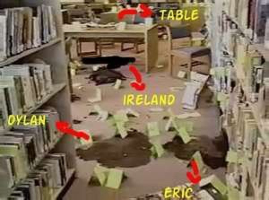 After leaving the cafeteria, they returned to the main north and south hallways of the school and fired several shots into walls and ceilings as students and teachers hid in rooms. They walked through the south hallway into the main office before returning to the north hallway. At 11:56a.m., they returned to the cafeteria, and briefly entered the school kitchen. They returned up the staircase and into the south hallway at 12:00p.m. They re-entered the library, which was empty of survivors except for the unconscious Patrick Ireland and the injured Lisa Kreutz. Once inside, at 12:02p.m., police were shot at again through the library windows and returned fire. Nobody was injured in the exchange. By 12:05p.m., all gunfire from the school had ceased. By 12:08p.m., both gunmen had killed themselves. Harris sat down with his back to a bookshelf and fired his shotgun through the roof of his mouth; Klebold went down on his knees and shot himself in the left temple with his TEC-9. An article by The Rocky Mountain News stated that Patti Nielson overheard them shout “One! Two! Three!” in unison, just before a loud boom, however Nielson claimed that she had never spoken with either of the writers of the article. In 2002, the National Enquirer published two post-mortem photos of Harris and Klebold in the library. Klebold’s gun was underneath his body and so unseen in the photo, leading to speculation that Harris shot Klebold before killing himself. However, some of Klebold’s blood was on Harris’ legs. Also, just before shooting himself, Klebold lit a Molotov cocktail on a nearby table, underneath which Patrick Ireland was laying, which caused the table top to momentarily catch fire. Underneath the scorched film of material was a piece of Harris’ brain matter, suggesting Harris had shot himself by this point.