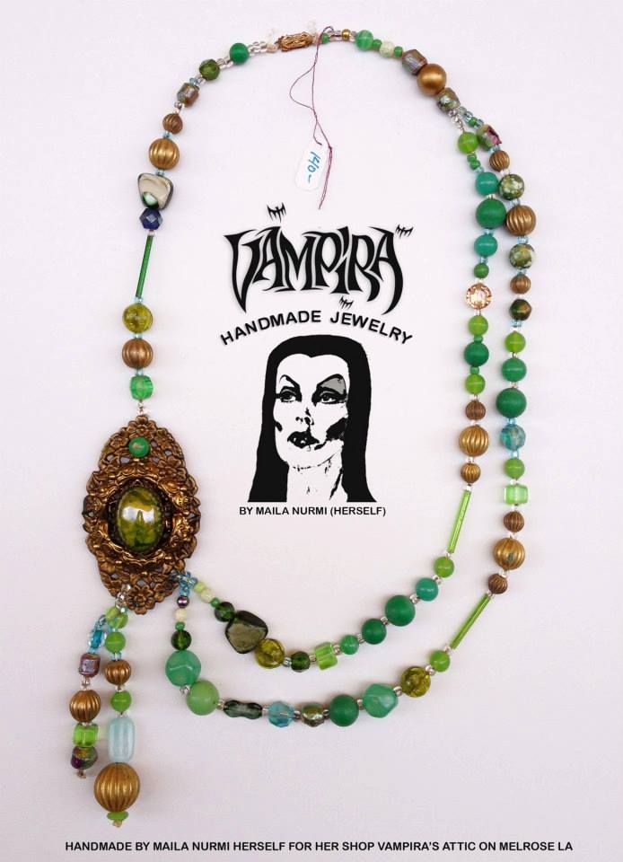 By 1962, Nurmi was making a living installing linoleum flooring. “And if things are slow in linoleum, I can also do carpentry, make drapes or refinish furniture”, she told the Los Angeles Times. In the early 1960s, Nurmi opened “Vampira’s Attic”, an antiques boutique on Melrose Avenue. She also sold handmade jewellery and clothing. She made items for several celebrities, including Grace Slick of the music group Jefferson Airplane and the Zappa family.