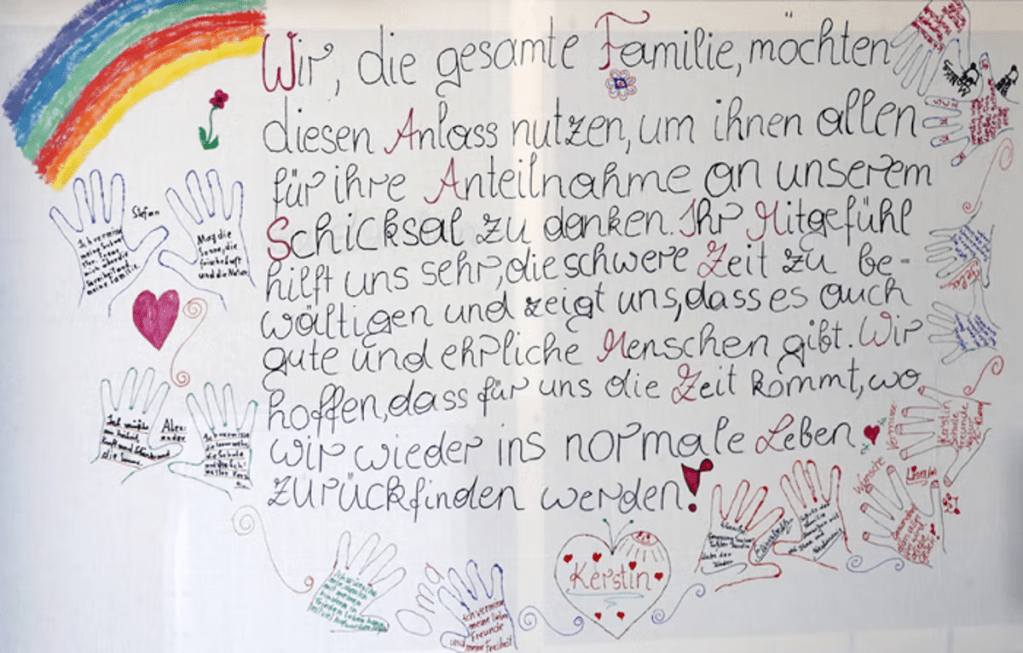 In May 2008, a handmade poster created by Elisabeth, her children and her mother at the therapy facility was displayed in the Amstetten town center. The message thanked local people for their support. “We, the whole family, would like to take the opportunity to thank all of you for sympathy at our fate,” they wrote in their message. “Your compassion is helping us greatly to overcome these difficult times, and it shows us there also are good and honest people here who really care for us. We hope that soon there will be a time where we can find our way back into a normal life.” Kerstin was reunited with her family on June 8, 2008, when she was awakened from her artificially induced coma. Doctors said that she would make a full recovery. It was revealed that Elisabeth and her children were more traumatized than previously thought. During captivity, Kerstin tore out her hair in clumps, and was reported to have shredded her dresses before stuffing them in the toilet. Stefan could not walk properly, due to his height of 1.73 m (5ft 8in), forced to stoop in the 1.68m (5ft 6 in) high cellar. It has also been revealed that normal everyday occurrences, such as the dimming of lights or the closing of doors, plunge Kerstin and Stefan into anxiety and panic attacks. The other three of Elisabeth’s children who were raised by their father are being treated for anger and resentment at the events.