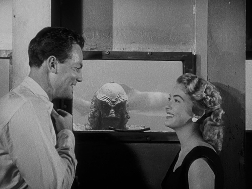 Director Jack Arnold liked to use the sides of the movie screen as the arches in a proscenium-style theater with unexpected intrusions coming in from the sidelines. This technique can be seen here when Professor Clete Ferguson (John Agar) goes out into the darkened area around the motel to look for Helen Dobson’s (Lori Nelson’s) missing dog. A hand suddenly reaches out from the right side of the screen to touch him, giving him (and the audience) a start, but it’s not the dreaded Gill-Man, it’s simply Lori Nelson.
