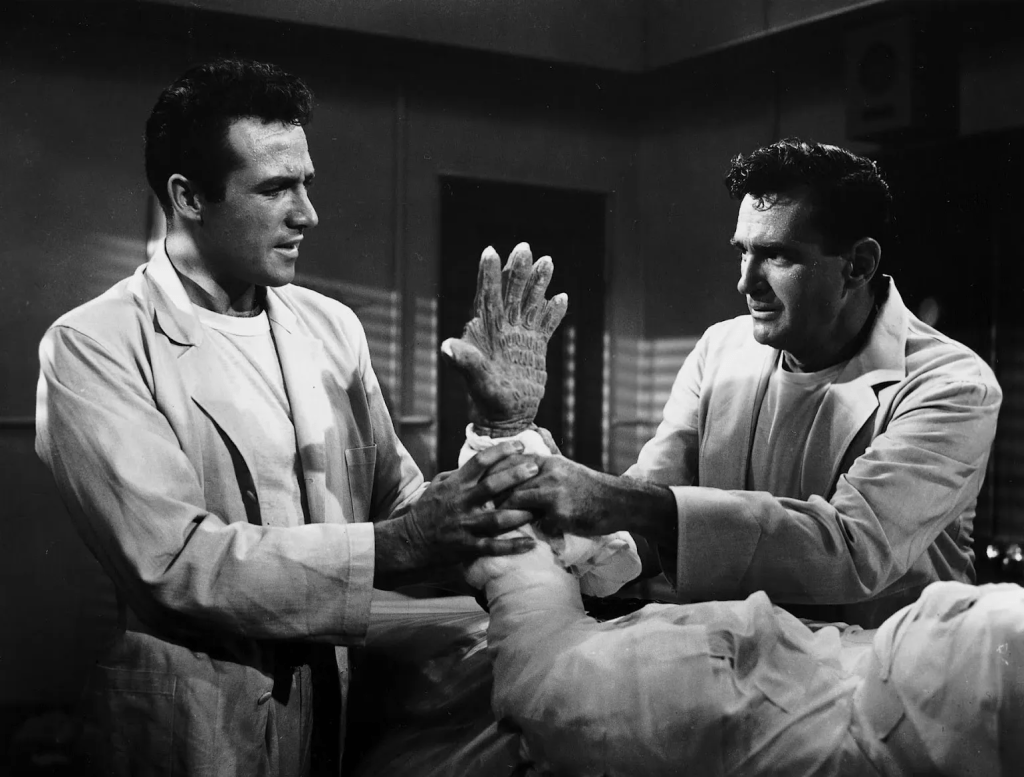 Rex Reason and Jeff Morrow had teamed up previously in another sci-fi classic, This Island Earth, released in 1955, one year before The Creature Walks Among Us. They played scientist Cal Meacham and the mysterious alien Exeter, respectively.