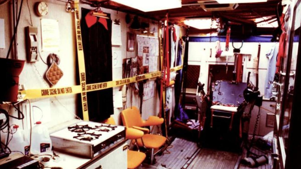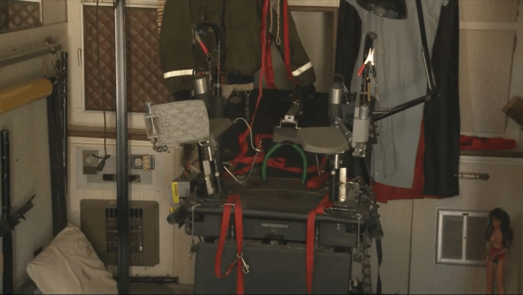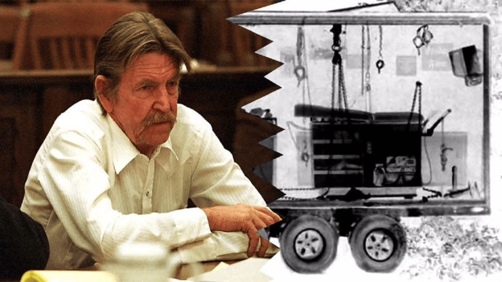 Ray spent $100,000 doing up his trailer (Ray’s torture room was a re-purposed, soundproofed cargo trailer), fitting it with sex toys and torture devices. He nicknamed it “the Toy Box”, which was equipped with what he referred to as his “friends”: whips, chains, pulleys, straps, clamps, leg spreader bars, and surgical blades and saws. With these tools it is thought that he terrorized Truth or Consequences, New Mexico for several years with the added assistance of multiple accomplices. Inside the torture room, along with numerous sex toys, torture implements, syringes and detailed diagrams (made by Ray himself) showing different methods and techniques for inflicting pain. Reportedly, Ray constructed elaborate contraptions to confine his victims, such as a fur-lined coffin and a makeshift pillory. In addition, there were also elaborate locks and pulleys to prevent his captives from escaping. There was a homemade electricity generating device that was used in torture. A mirror was mounted in the ceiling, above the obstetric table to which he strapped his victims so that they would be able to see themselves be raped and tortured. He has been said to have wanted his victims to see everything he was doing to them. Ray also put his victims in wooden contraptions that bent them over and immobilized them while he had his dogs and sometimes other friends rape them. Ray would often have a recorded audio tape of himself played for his victims whenever they regained consciousness. Accomplices were allegedly thought to have been several of the women he was dating.