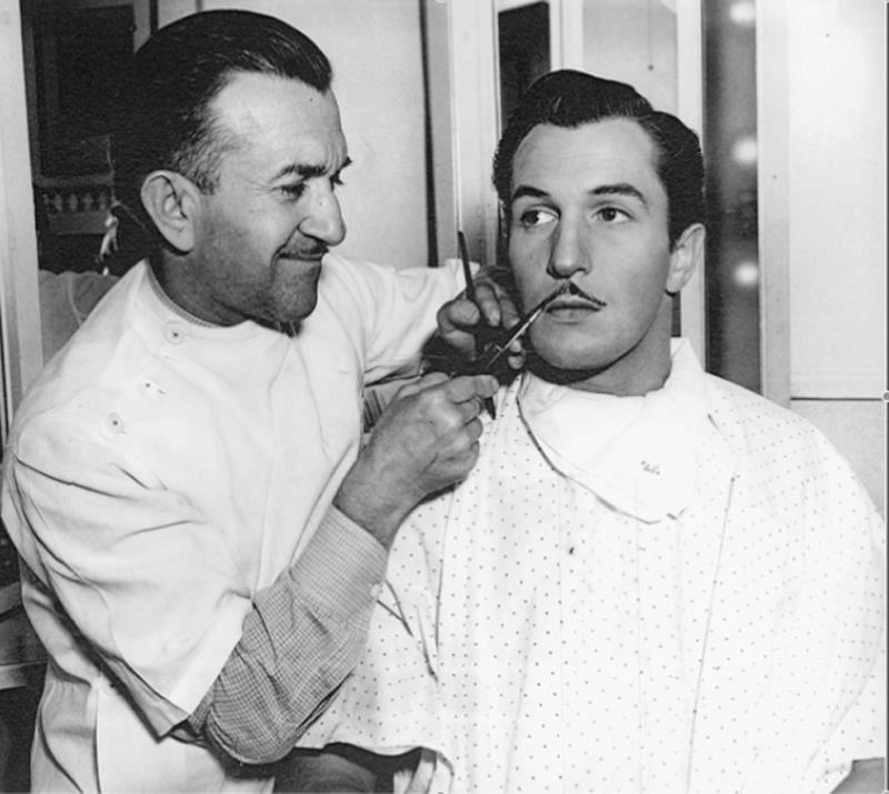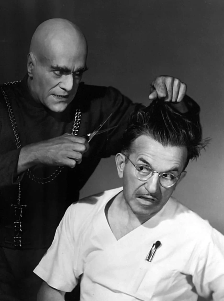 Outside of his unusual horror makeups, a recurring signature of Pierce’s makeup was to give actors a widow’s peak hairline. Bela Lugosi and his Spanish-language counterpart Carlos Villarias both wore widow’s peak toupees in their respective versions of “Dracula” in 1931, and Lugosi’s makeup for 1932’s “White Zombie” included an even more severe widow’s peak. Pierce shaved the hairline of Boris Karloff and turned it into an arrow-like widow’s peak for the 1934 film “The Black Cat”, and had comedian Bud Abbott augment his thinning hairline with a widow’s peak toupee in his early films with Lou Costello. Pierce even gave Lon Chaney Jr. a low, pointed hairline in such Inner Sanctum films as “Strange Confession” and 1943’s “Son Of Dracula”. Conversely, for 1938’s “Service Deluxe”, a comedy in which Vincent Price made his film debut, Pierce flattened Price’s natural widow’s peak with hair plugs.